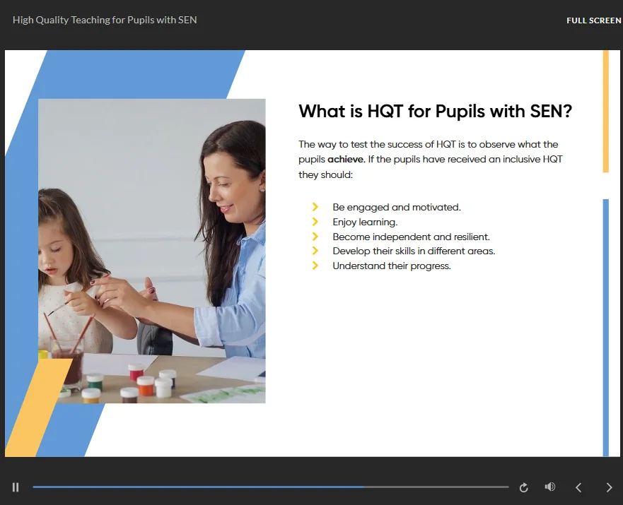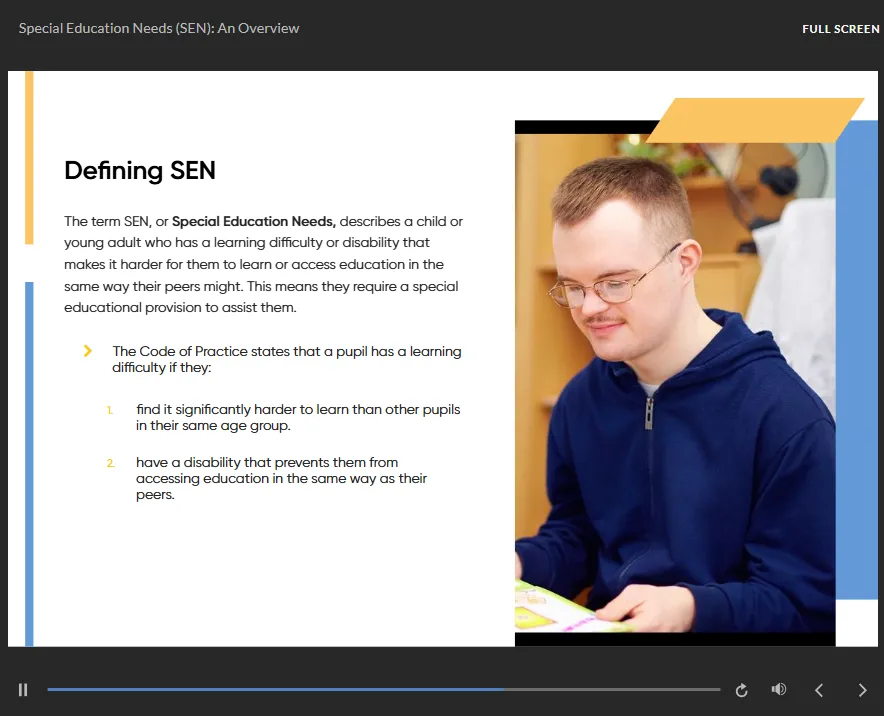 This SEN teaching assistant training explores key areas of SEN, including communication and interaction, cognition and learning, social, emotional and mental health needs, and sensory or physical difficulties. This online SEN TA course focuses on inclusive teaching approaches, SEN support structures, and the importance of effective partnership working within education.